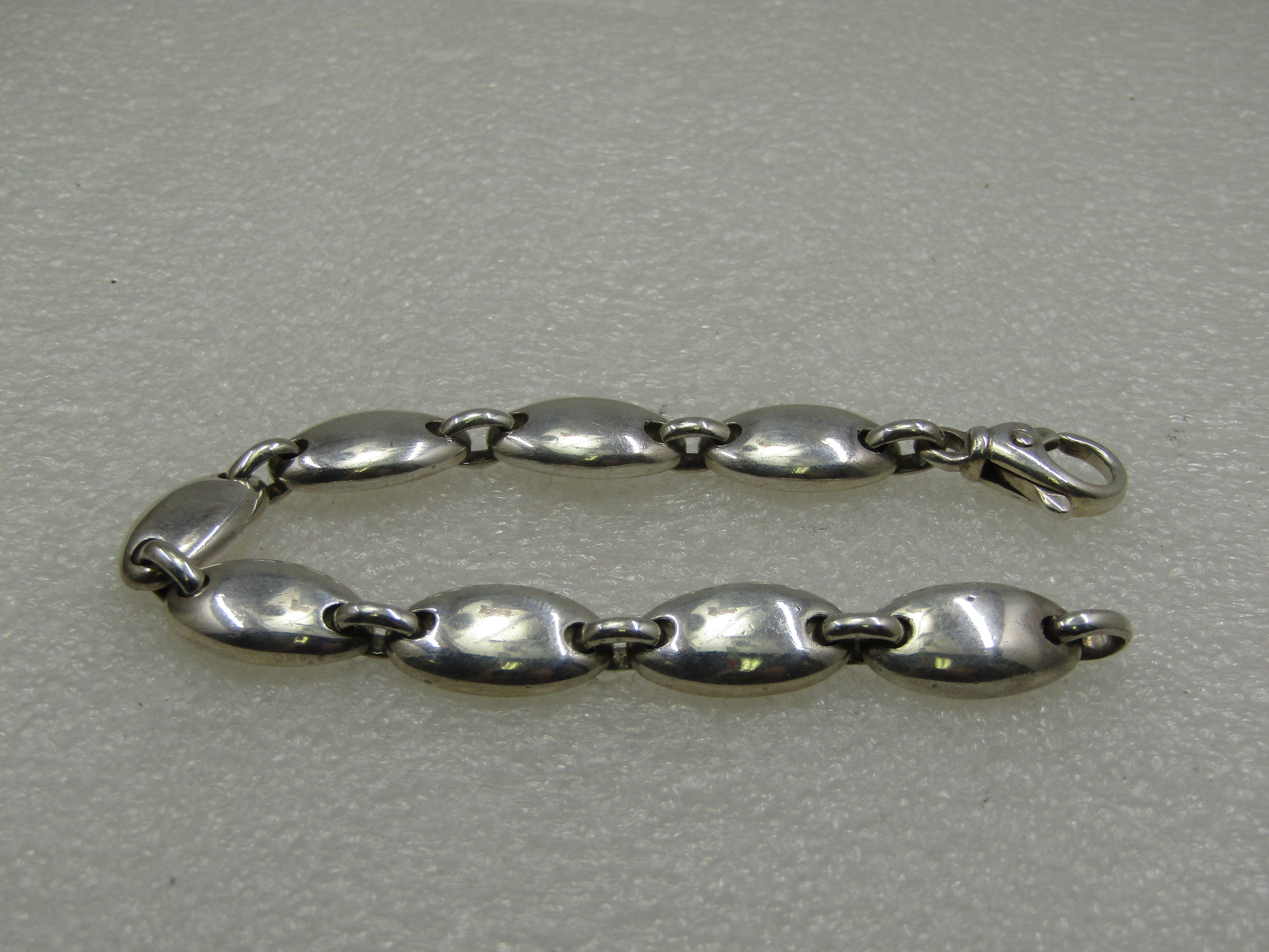Vintage Sterling Silver Tiffany Oval Link Bracelet, 7.5", Solid. Heavy lobster clasp. Signed Tiffany on link closest to clasp. Weight of the bracelet is appx. 43.78 gr. The oval links are appx. 10.5mm wide and domed on top. Heavy oval connector links. Typical finish wear from being worn but polishing will restore nicely. Very good condition. (INV. W. 101720.2X2 SS6089 J LD 11/26/21).