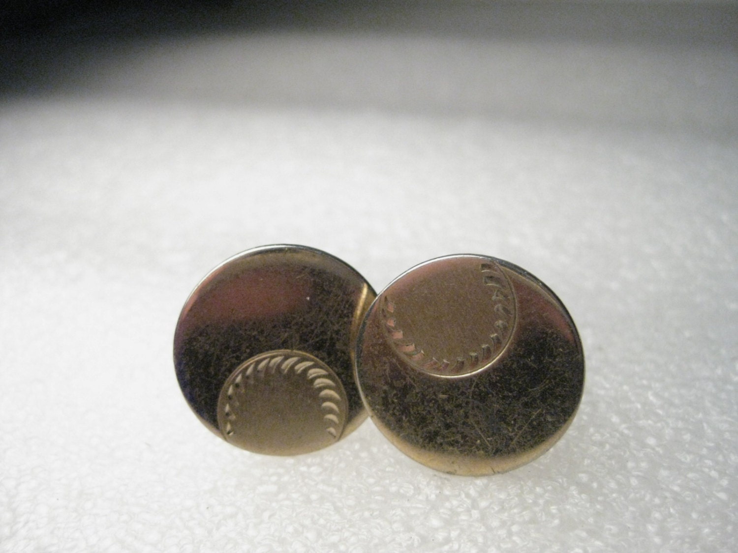 Vintage 1960's unsigned art deco cuff links - 3/4" round with a textured and smooth surface - an etched, engraved design that looks sort of like a baseball. Goldtone - Unisex. Very nice. See photos. (My Loc. Num. Win.9.13.b.4)