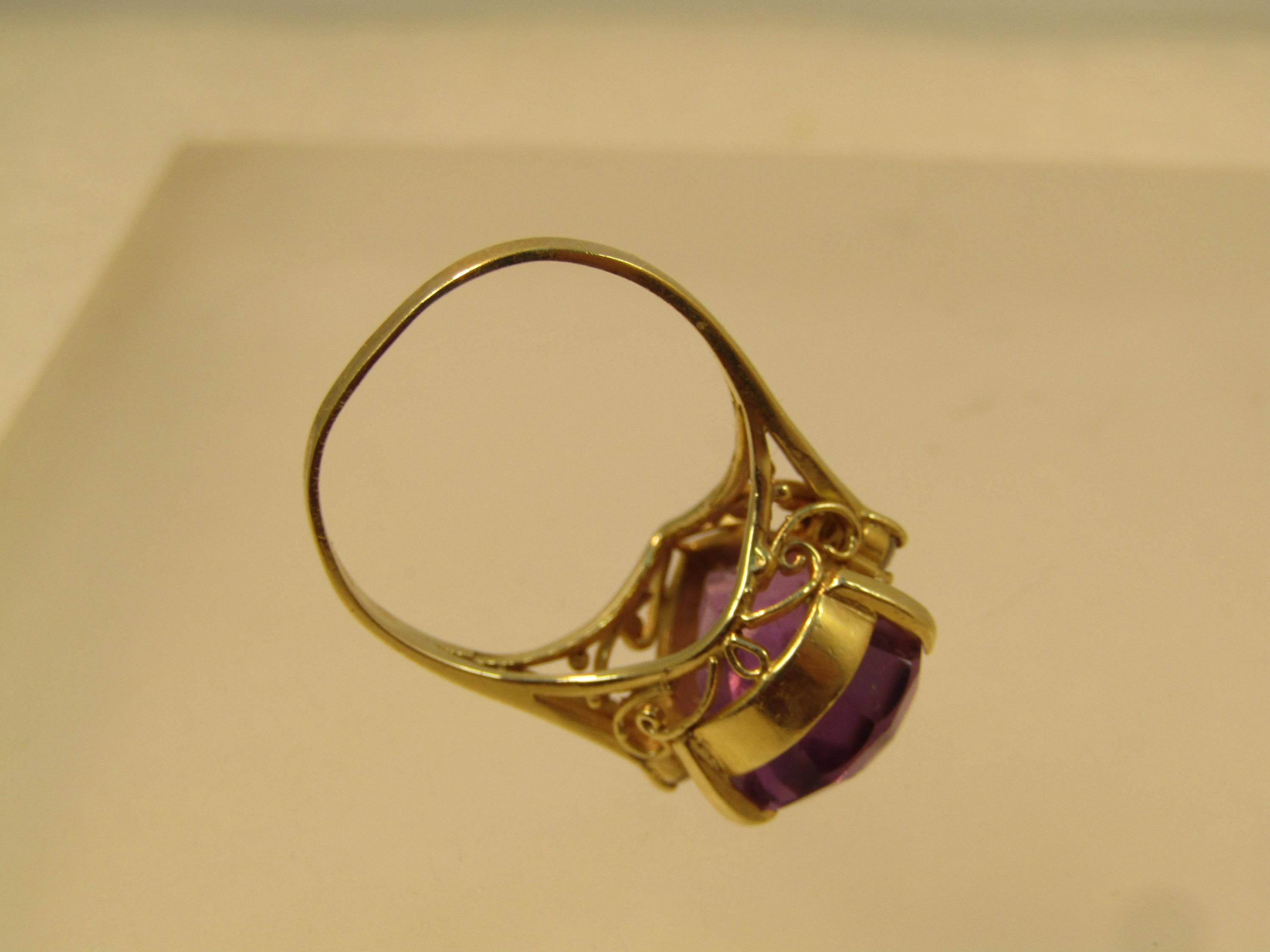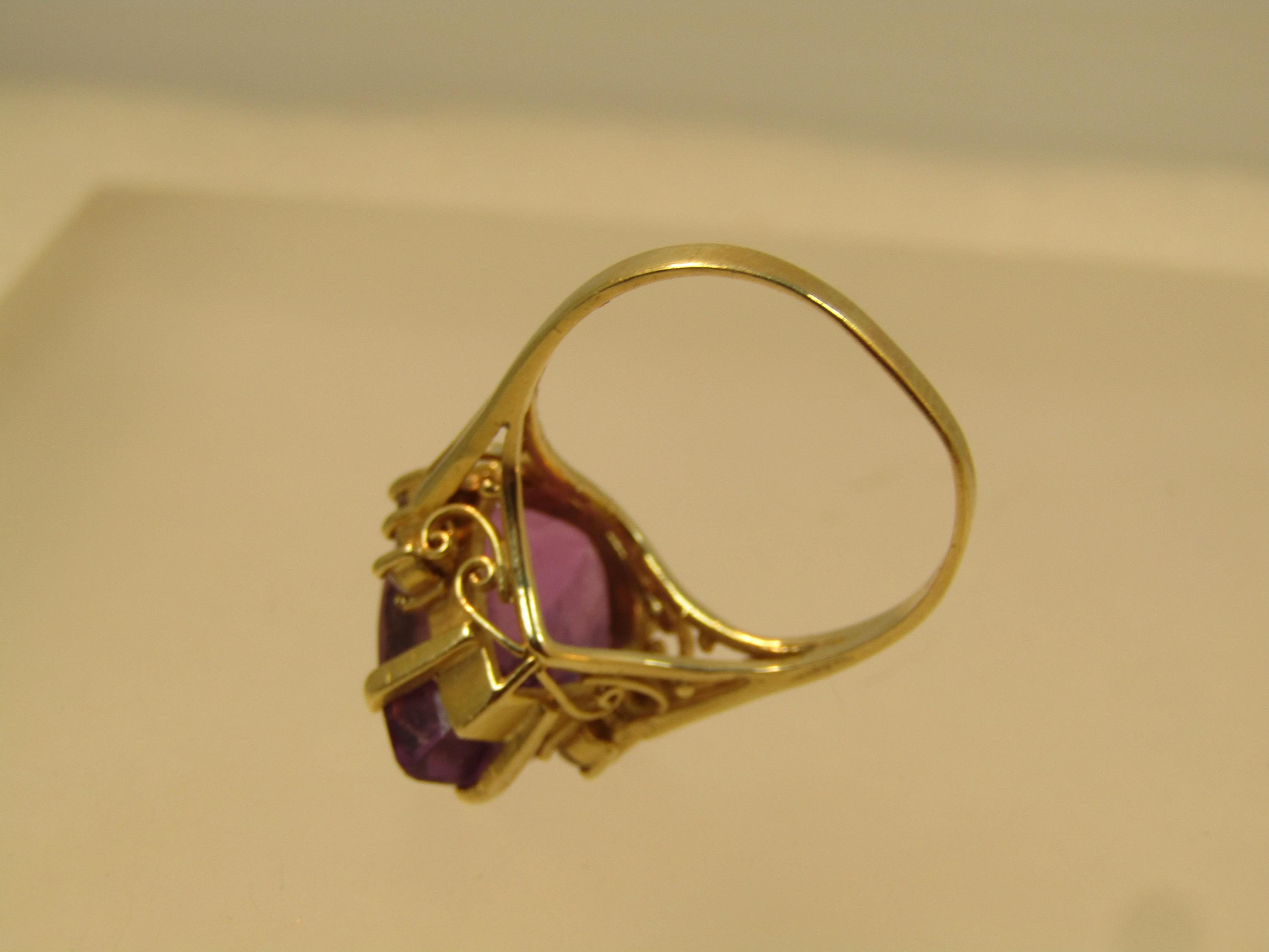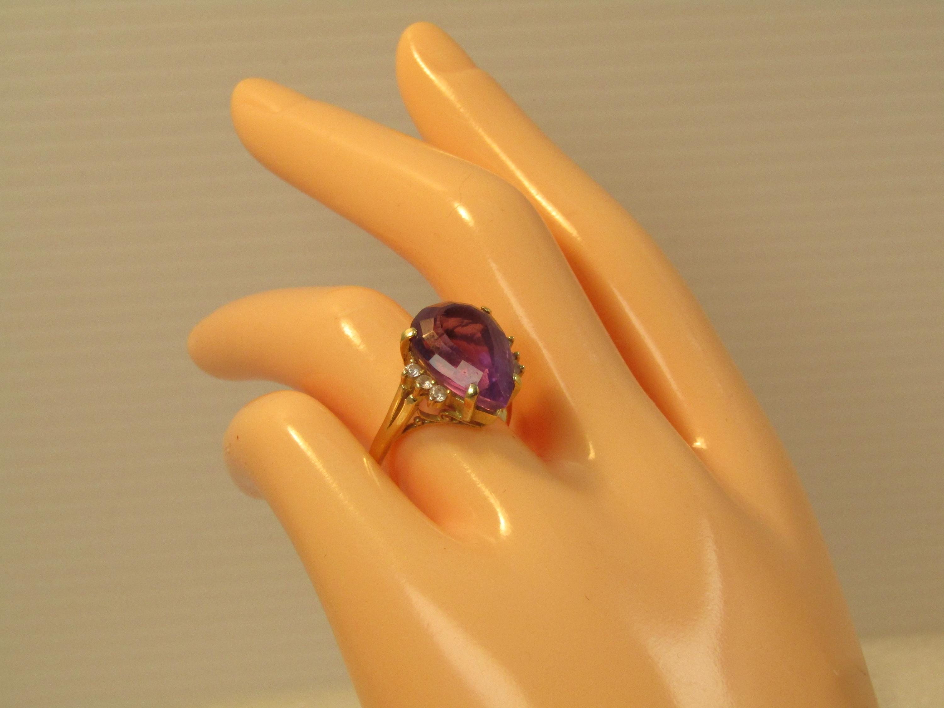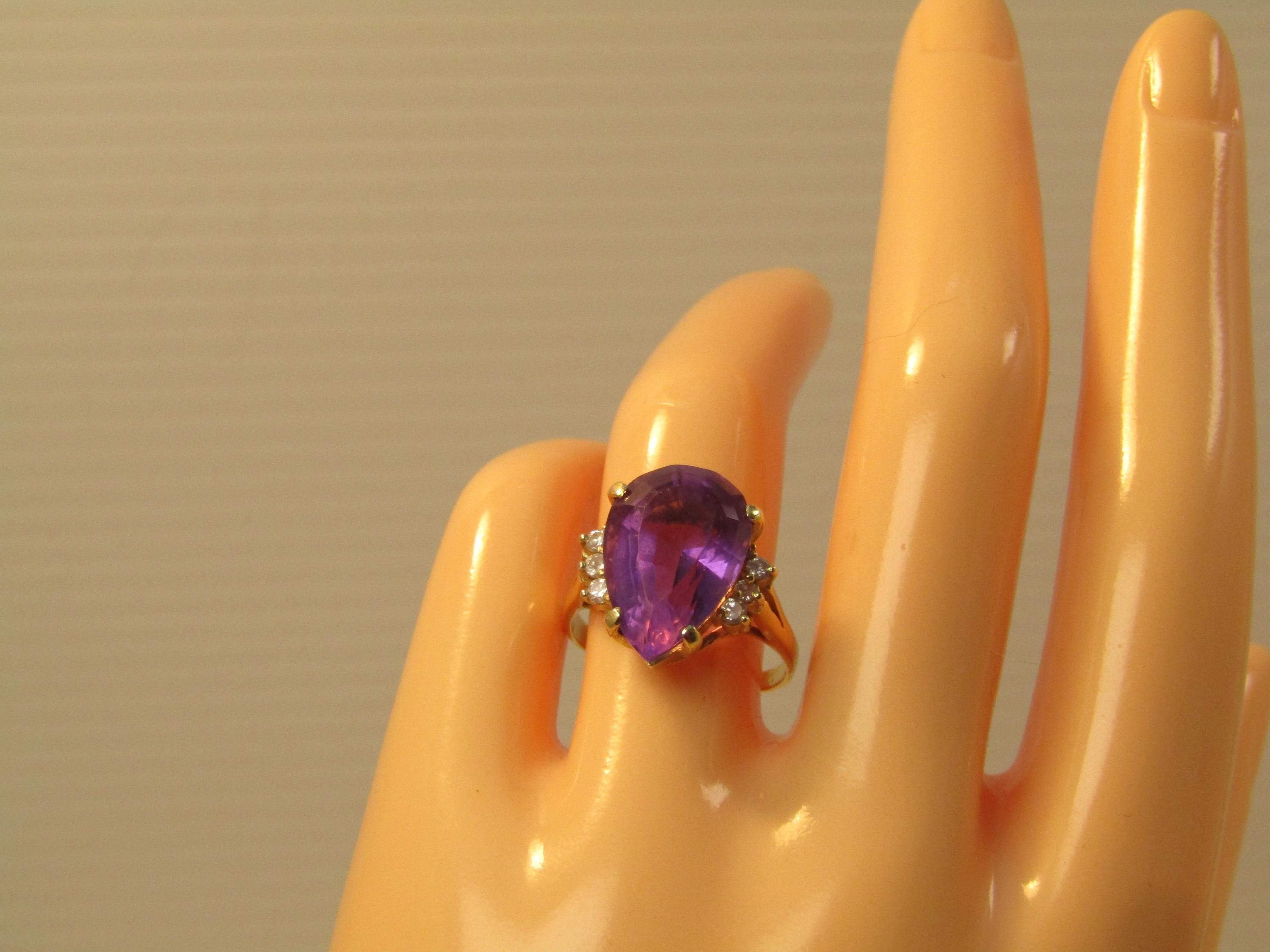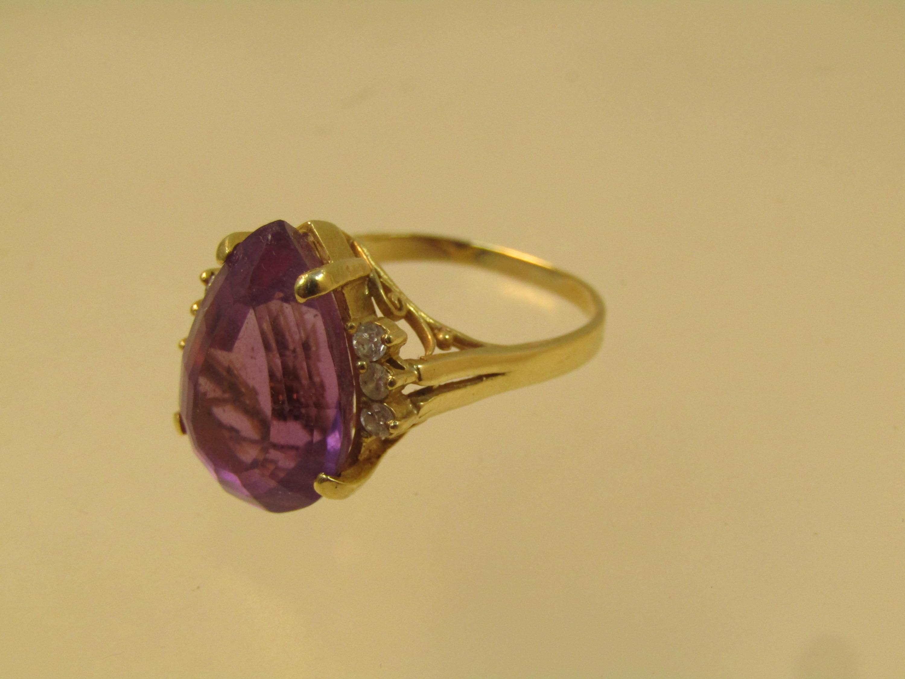 Vintage 14kt Amethyst Diamond Ring, 6.41 CTW Sz. 7, 1970's-1980's. Amethyst pear-shaped stone that is appx. 16mm by 10.5mm and 8mm thick. This is appx. 6.41 tcw. There are three diamonds on each side that are each appx. 1.8mm to 2mm. The ring weighs appx. 4.61 grams. It has a scrolled base below the setting and sits from the finger to the top fo the stone at appx. 9.90mm. This is yellow gold and tests as 10kt. It is not signed or marked. This has a chip at the point facet otherwise very good condition. (AZ2326.52X3 SS17401 J LD 2/3/26)
