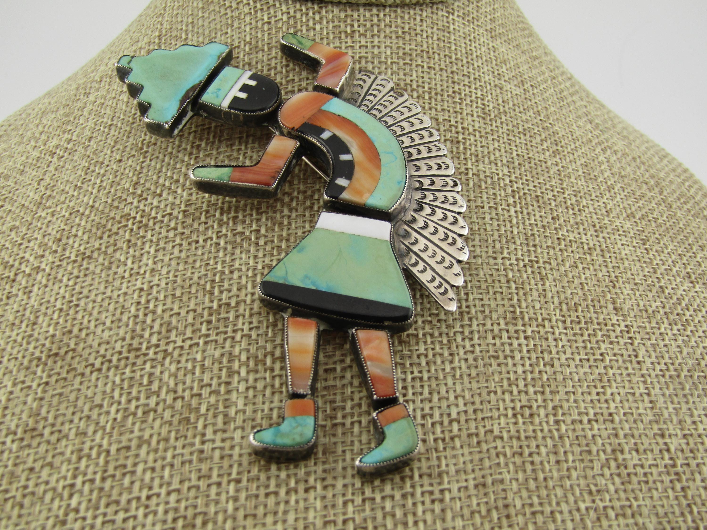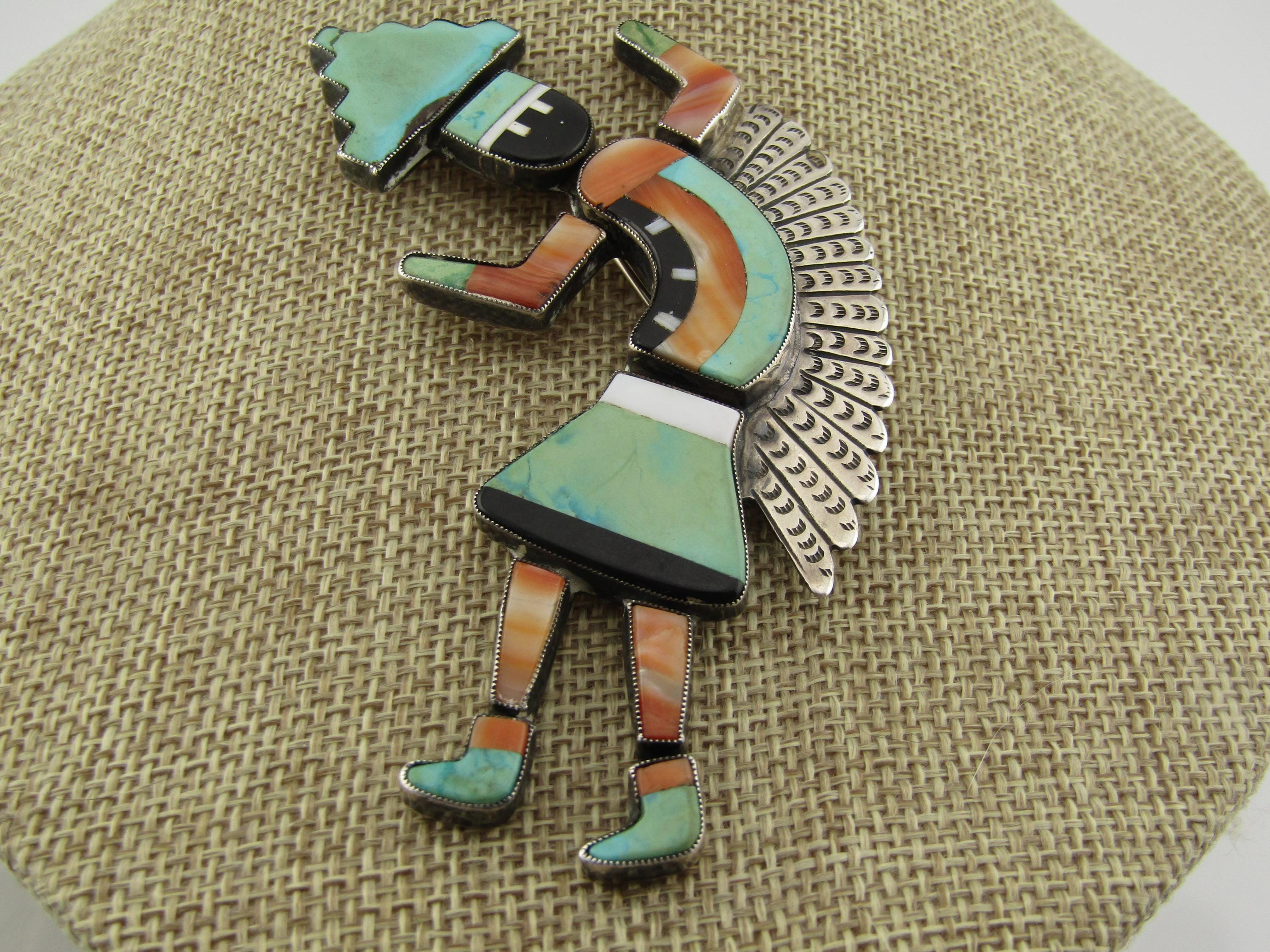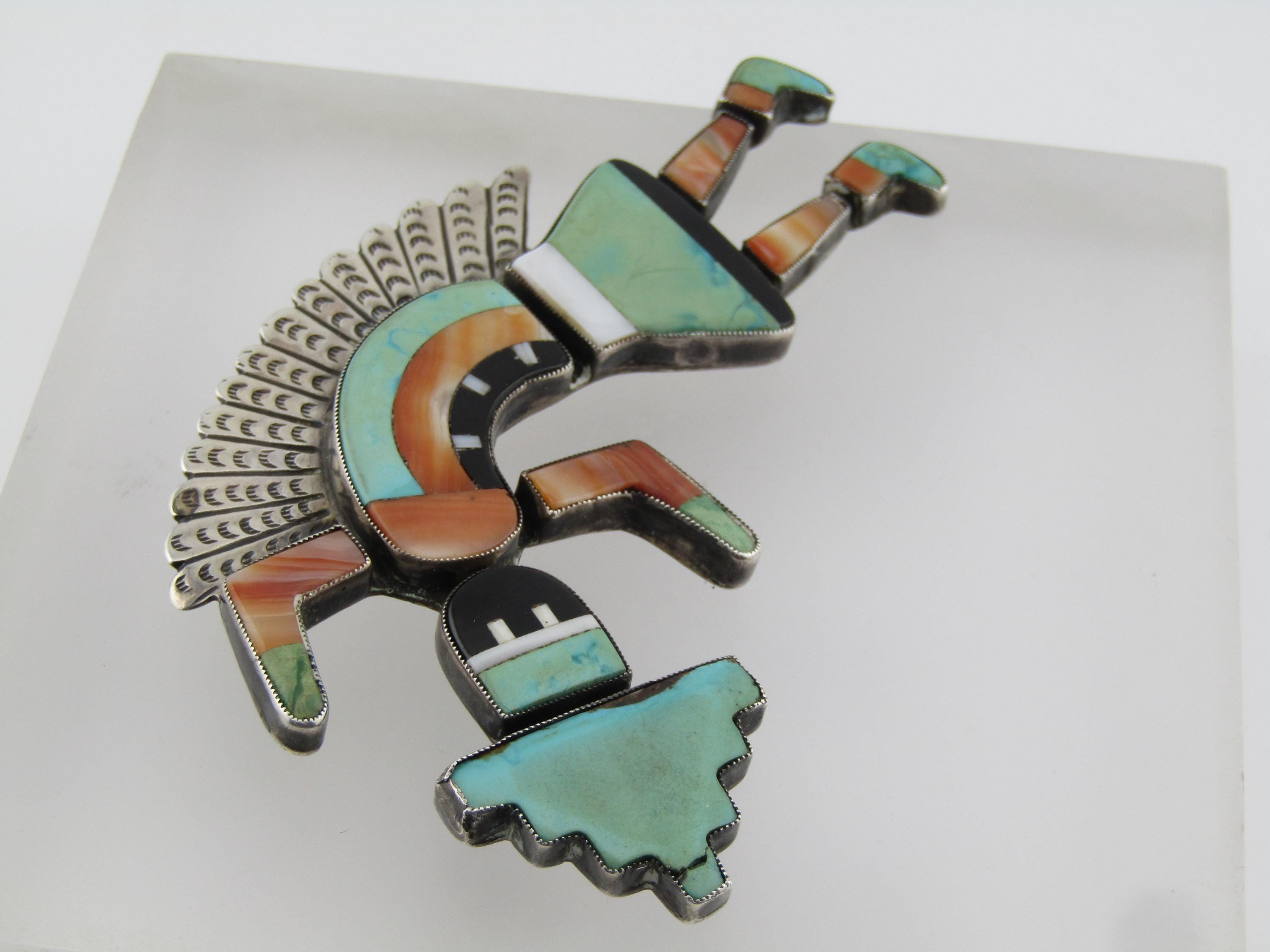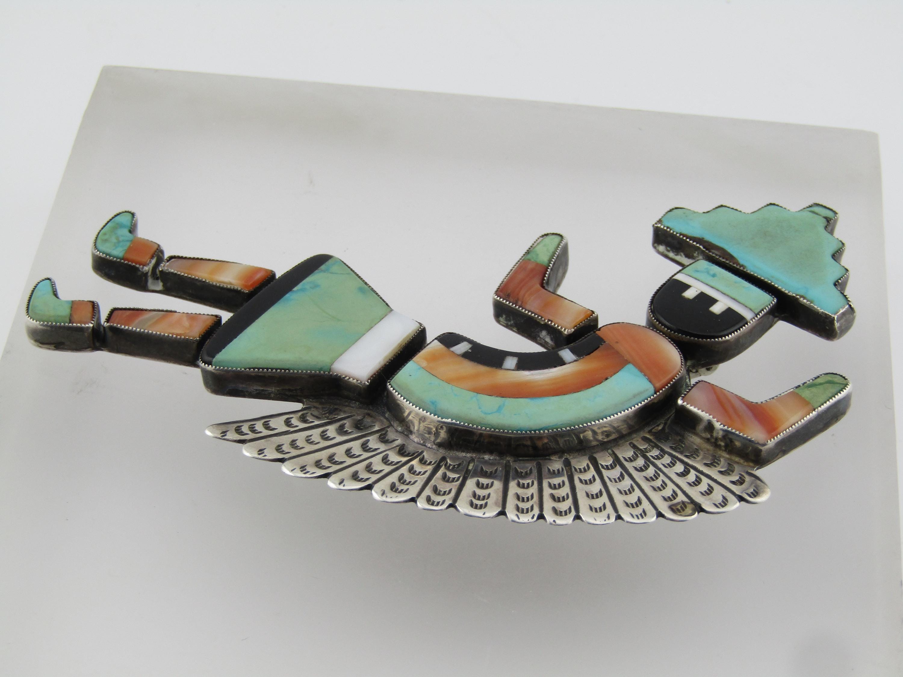 Vintage Zuni Inlaid Kachina Brooch, 3.75" tall and 2.25" wide. , 1960's-1980's, possibly older. This is marked with faint scratched letters MCO= and an A under that. It tests as sterling with a total weight of appx. 16.36 grams. The pin back has a design more matching mid 1900's than later. This has inlaid turquoise, spiny oyster, onyx, and white magnesite. The kachina danger has a sterling white feather accent on the back. The inlaid stones are set in sawtooth sterling silver bezels with a sold sterling back. This is a piece of jewelry art. Excellent condition and workmanship. (W32826.57X6 SS17525 J LD 4/4/26).
