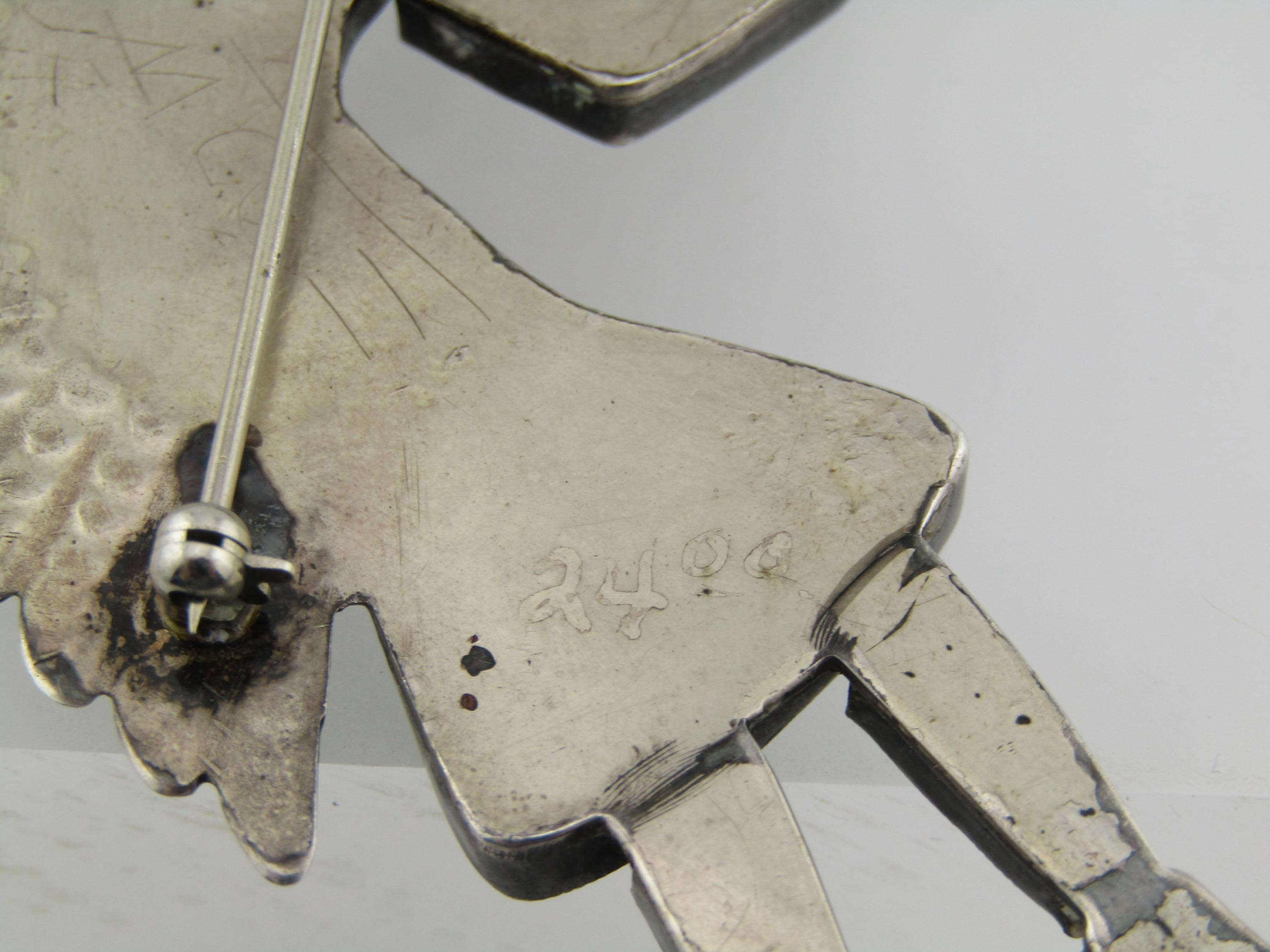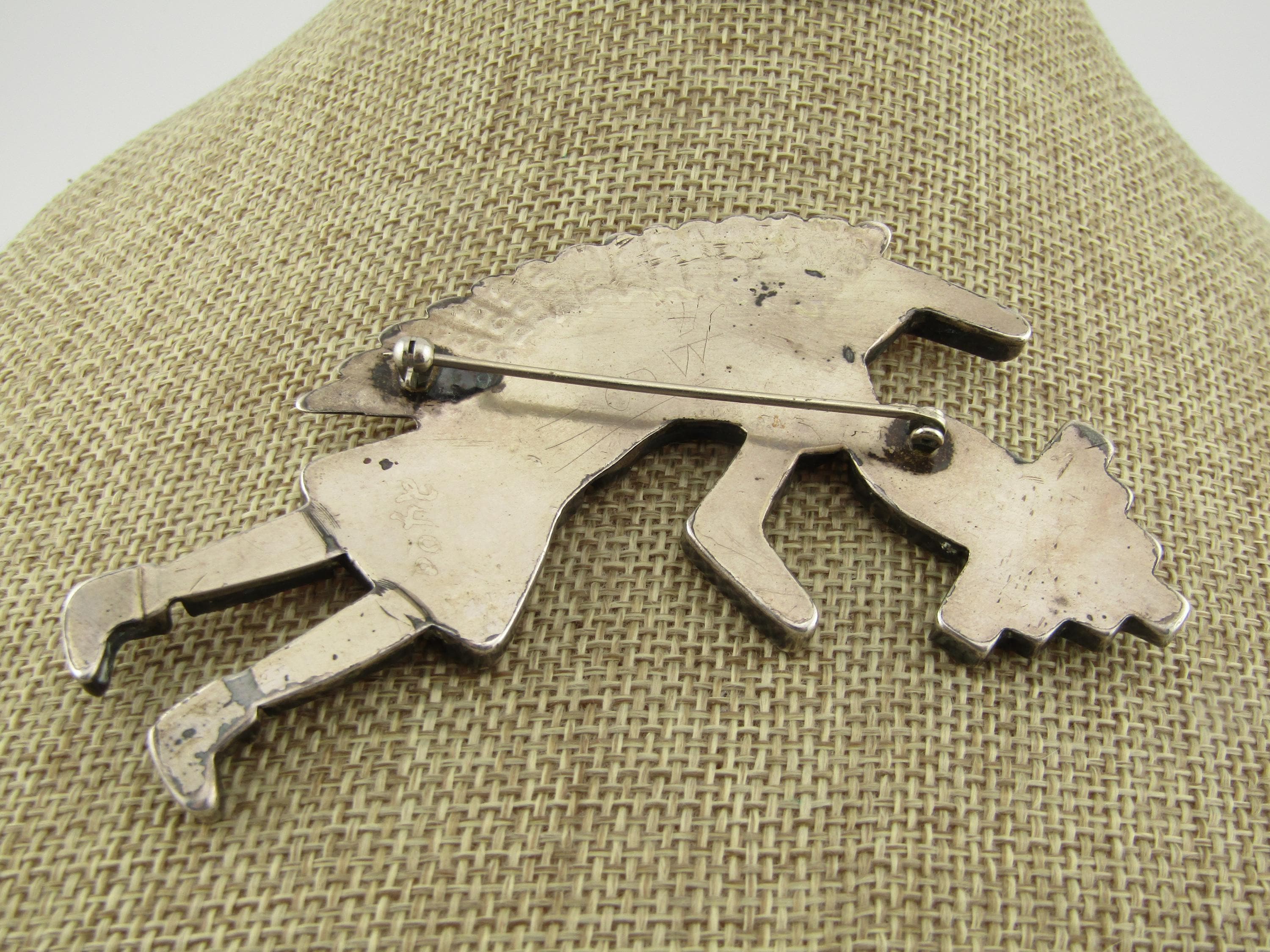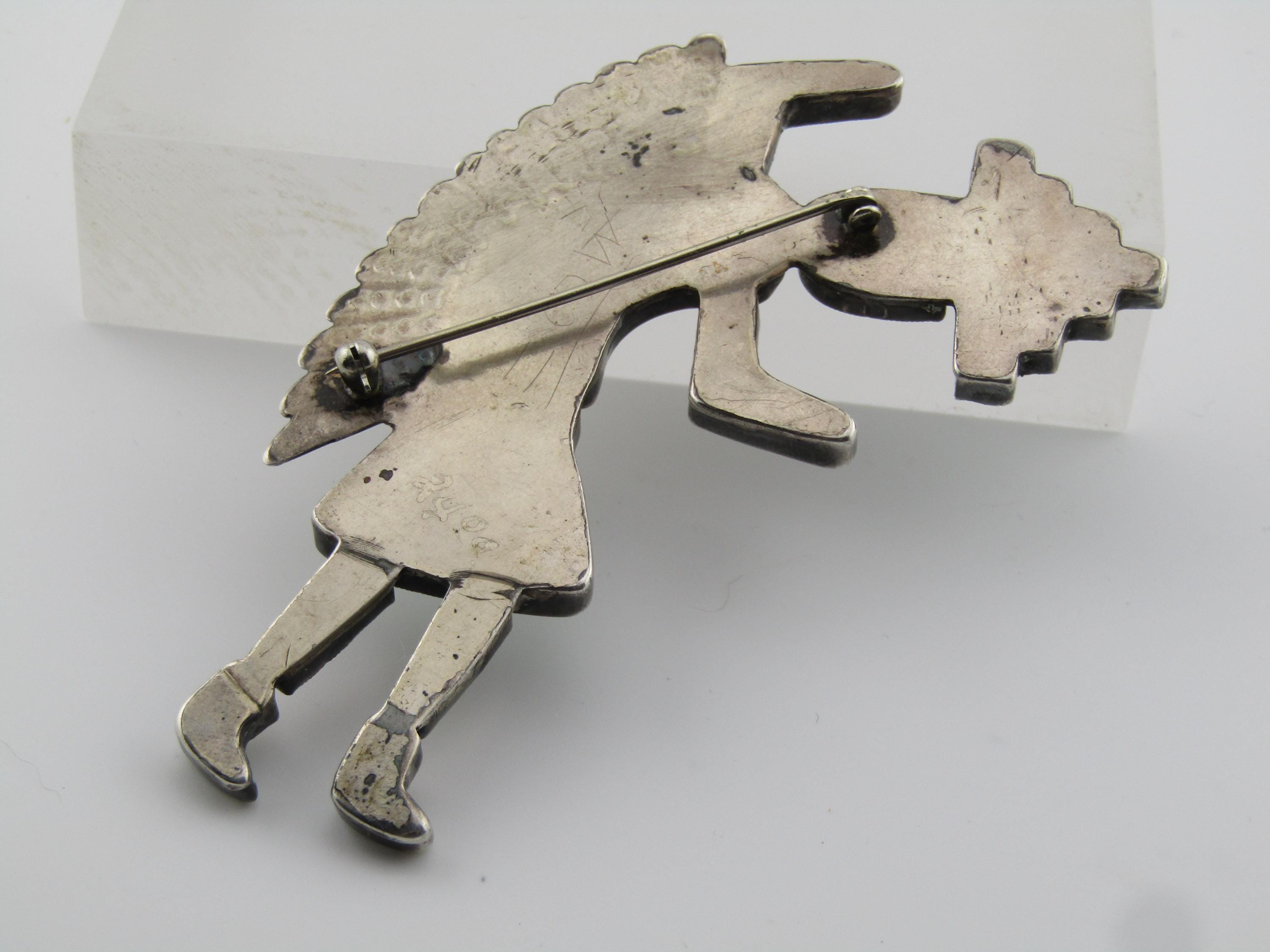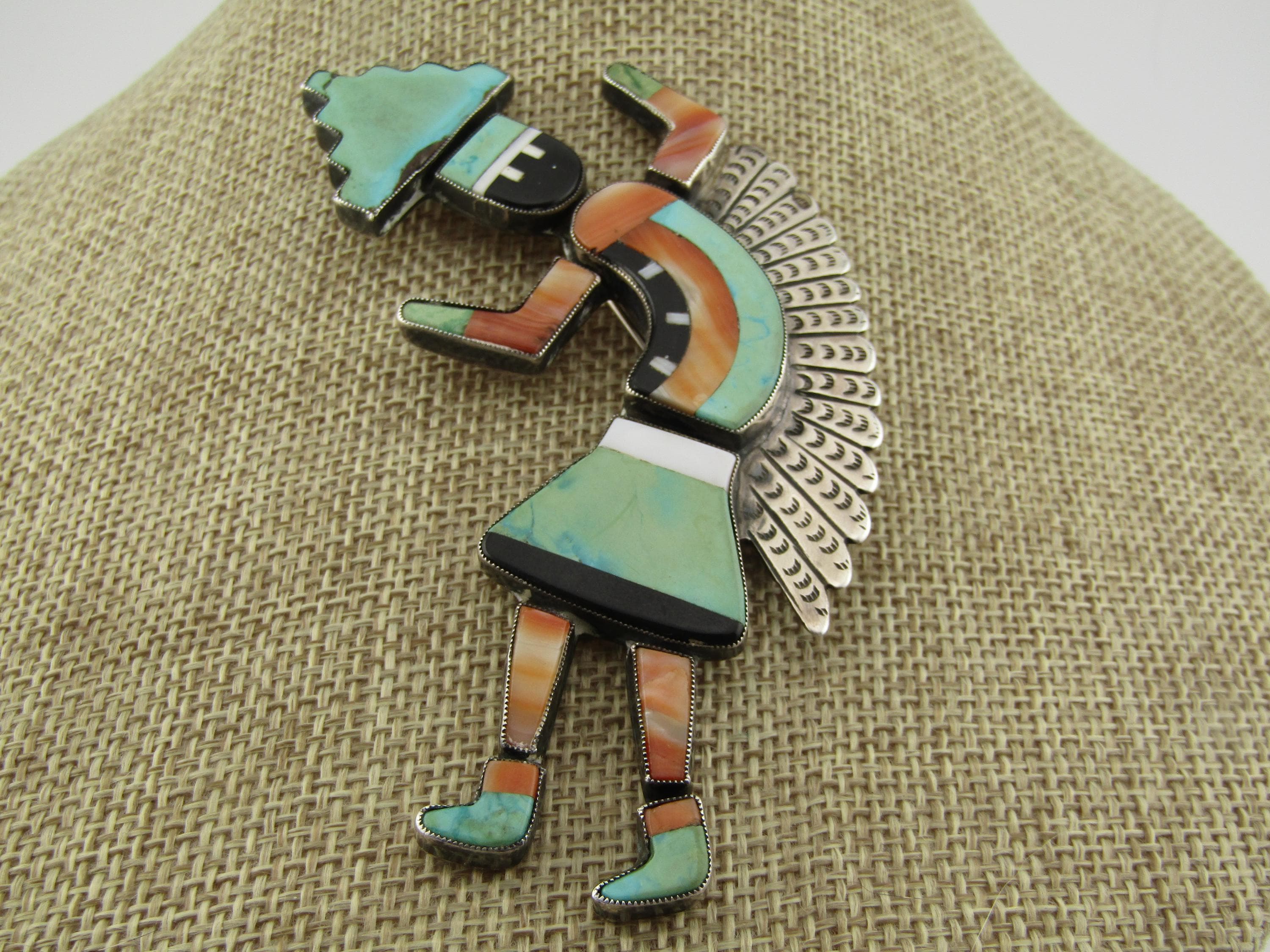 Vintage Zuni Inlaid Kachina Brooch, 3.75" tall and 2.25" wide. , 1960's-1980's, possibly older. This is marked with faint scratched letters MCO= and an A under that. It tests as sterling with a total weight of appx. 16.36 grams. The pin back has a design more matching mid 1900's than later. This has inlaid turquoise, spiny oyster, onyx, and white magnesite. The kachina danger has a sterling white feather accent on the back. The inlaid stones are set in sawtooth sterling silver bezels with a sold sterling back. This is a piece of jewelry art. Excellent condition and workmanship. (W32826.57X6 SS17525 J LD 4/4/26).