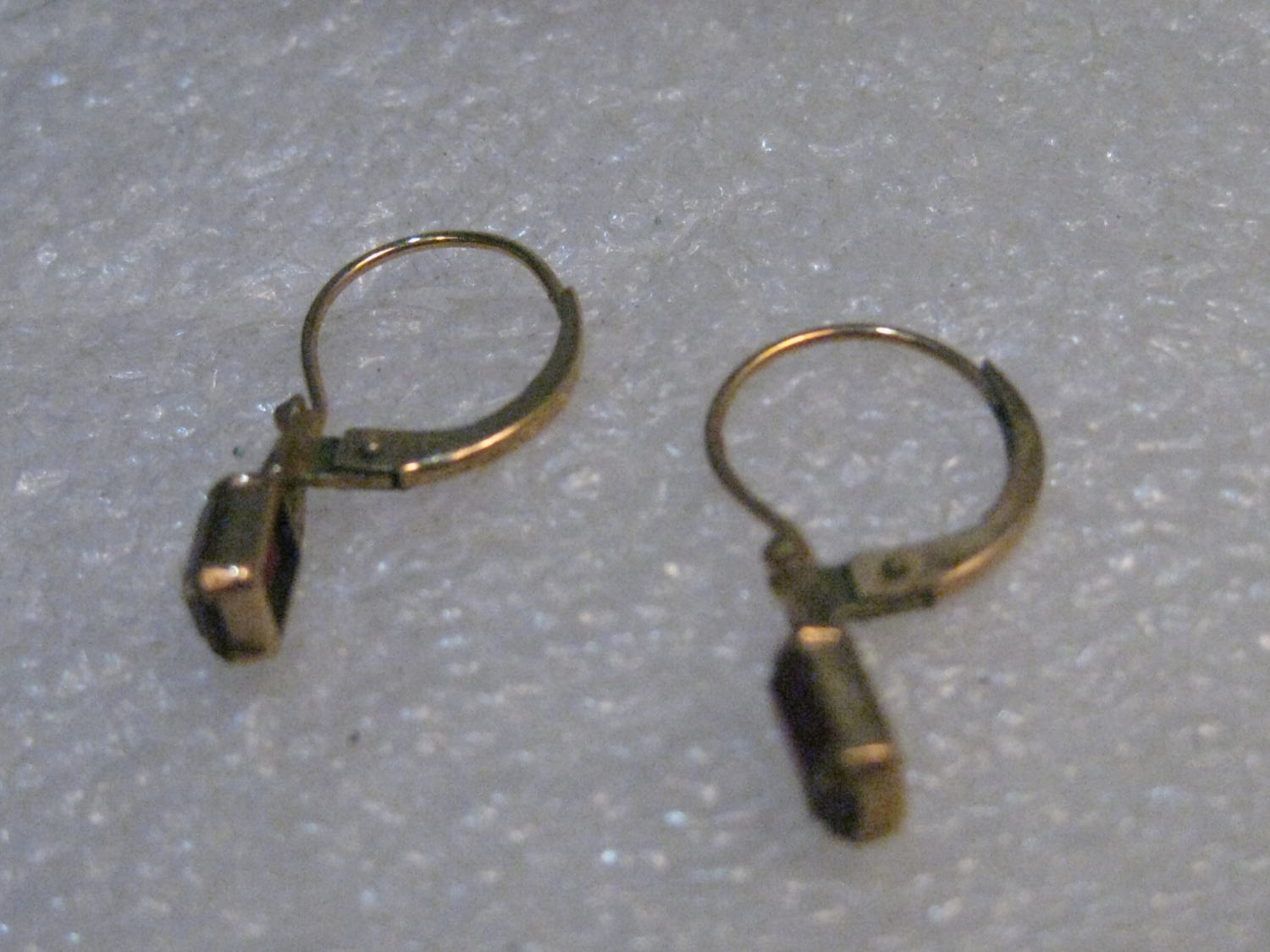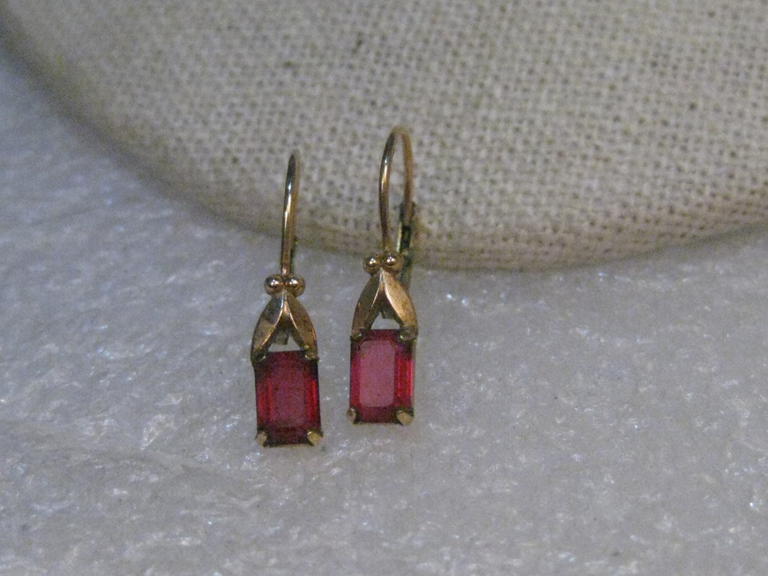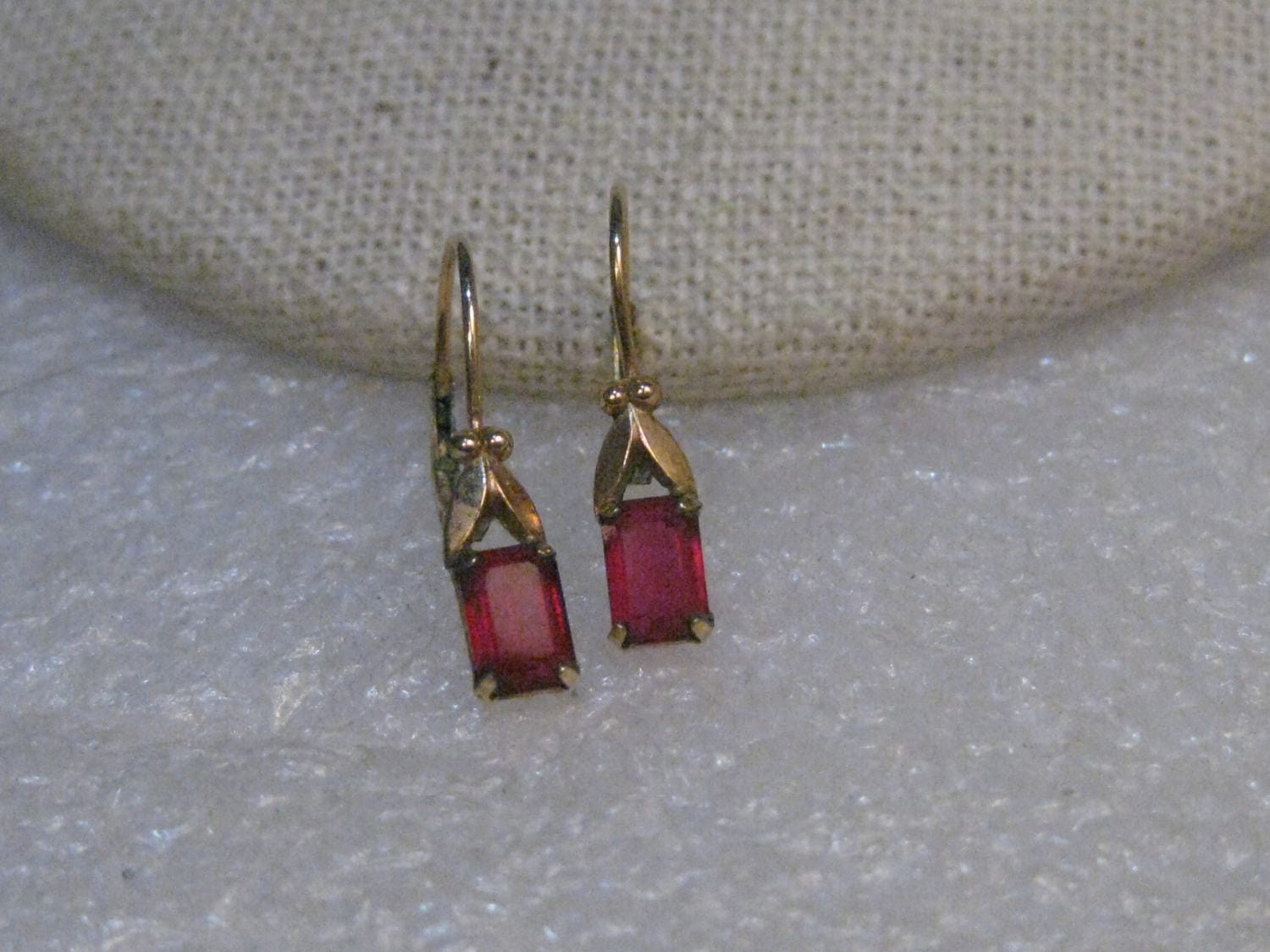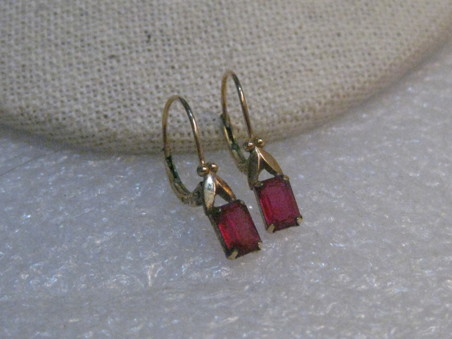 Vintage Faux Ruby Pierced Earrings, Dangle Lever Backs, marked roll gold. The faux rubies are a rectangular emerald cut stone that is 6mm by 4mm. They are likely 1960's. They hang down from the lobe and have an open design accent above the stone. These are in good condition to very good condition. They have been cleaned since the photo. They are not signed by the maker but are signed "ROLL GOLD". This came from a PA estate. See photos. (Lot. Loc. W.1.7-2.417.G2.8) .