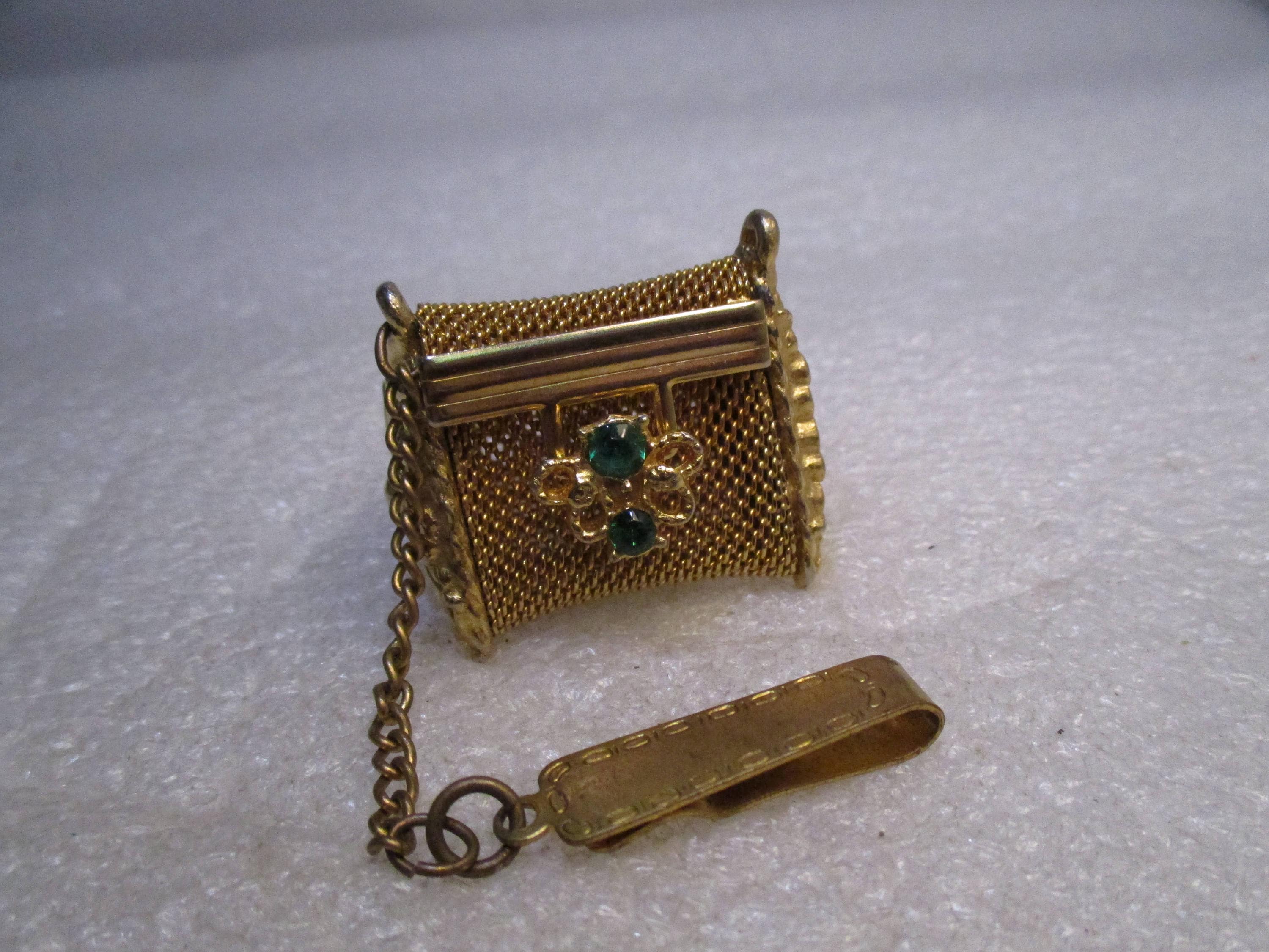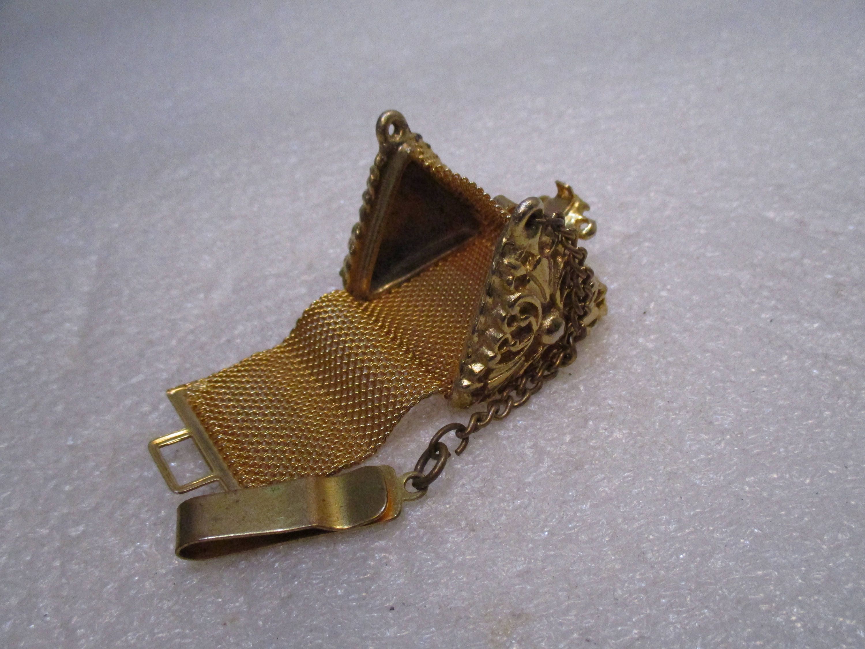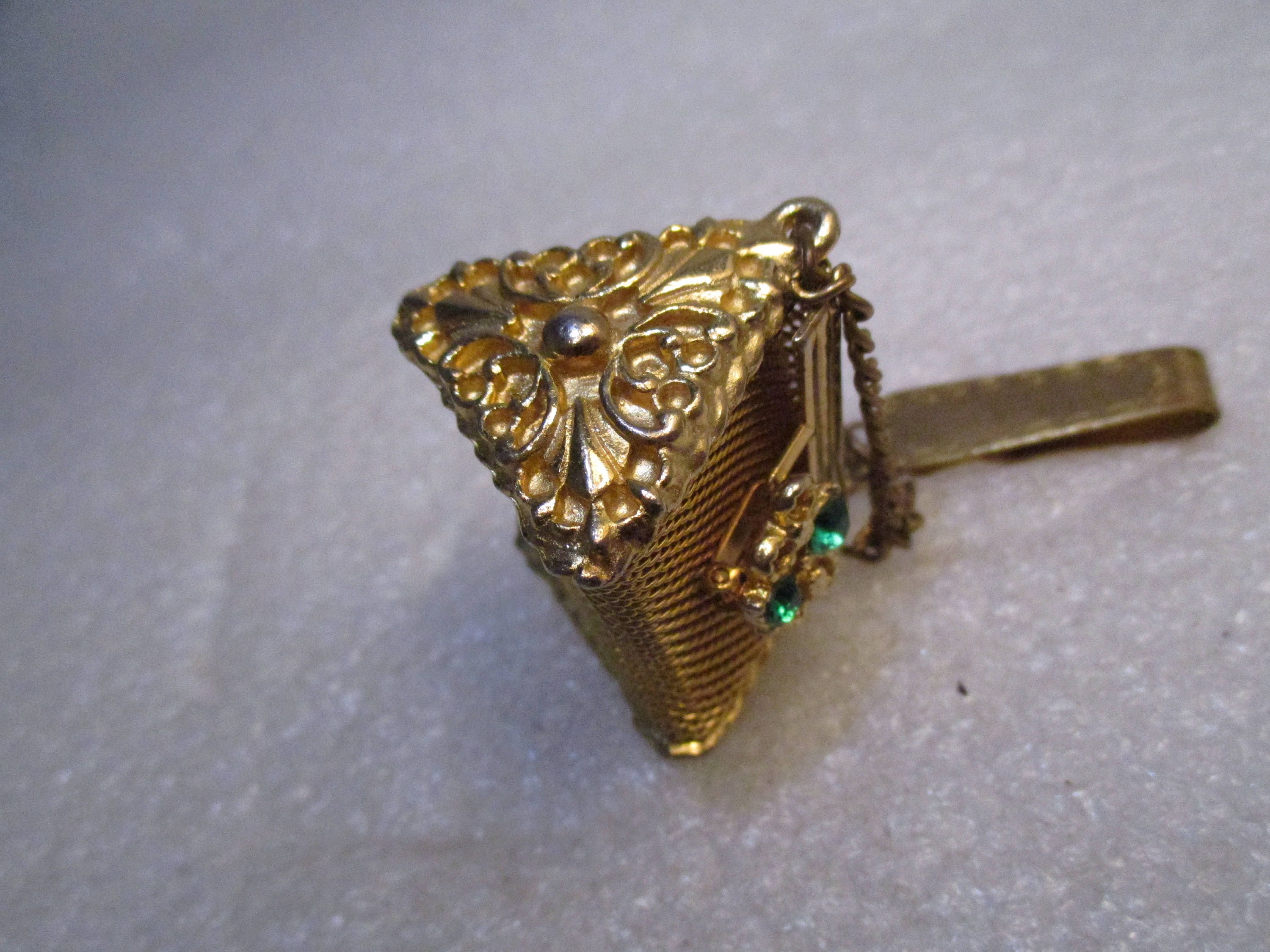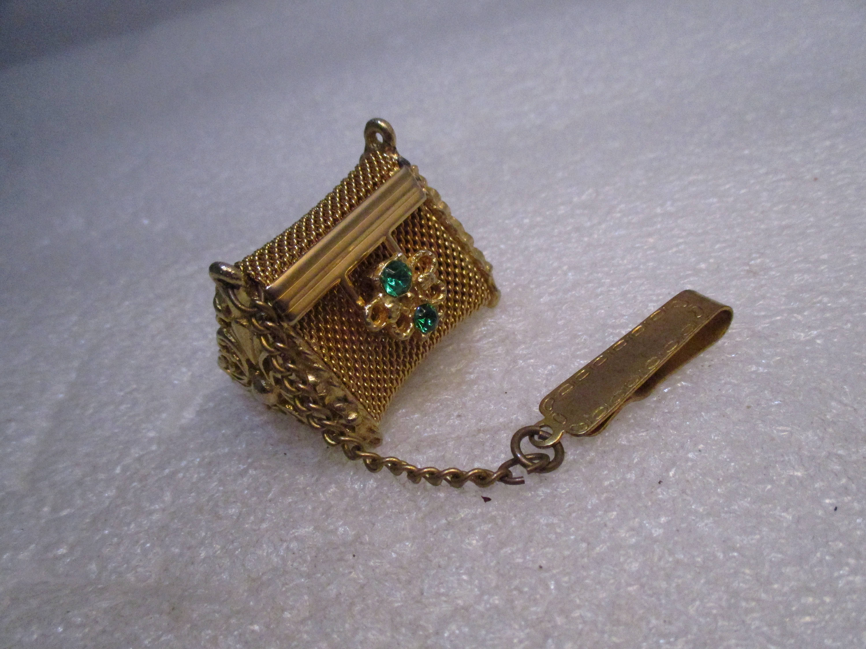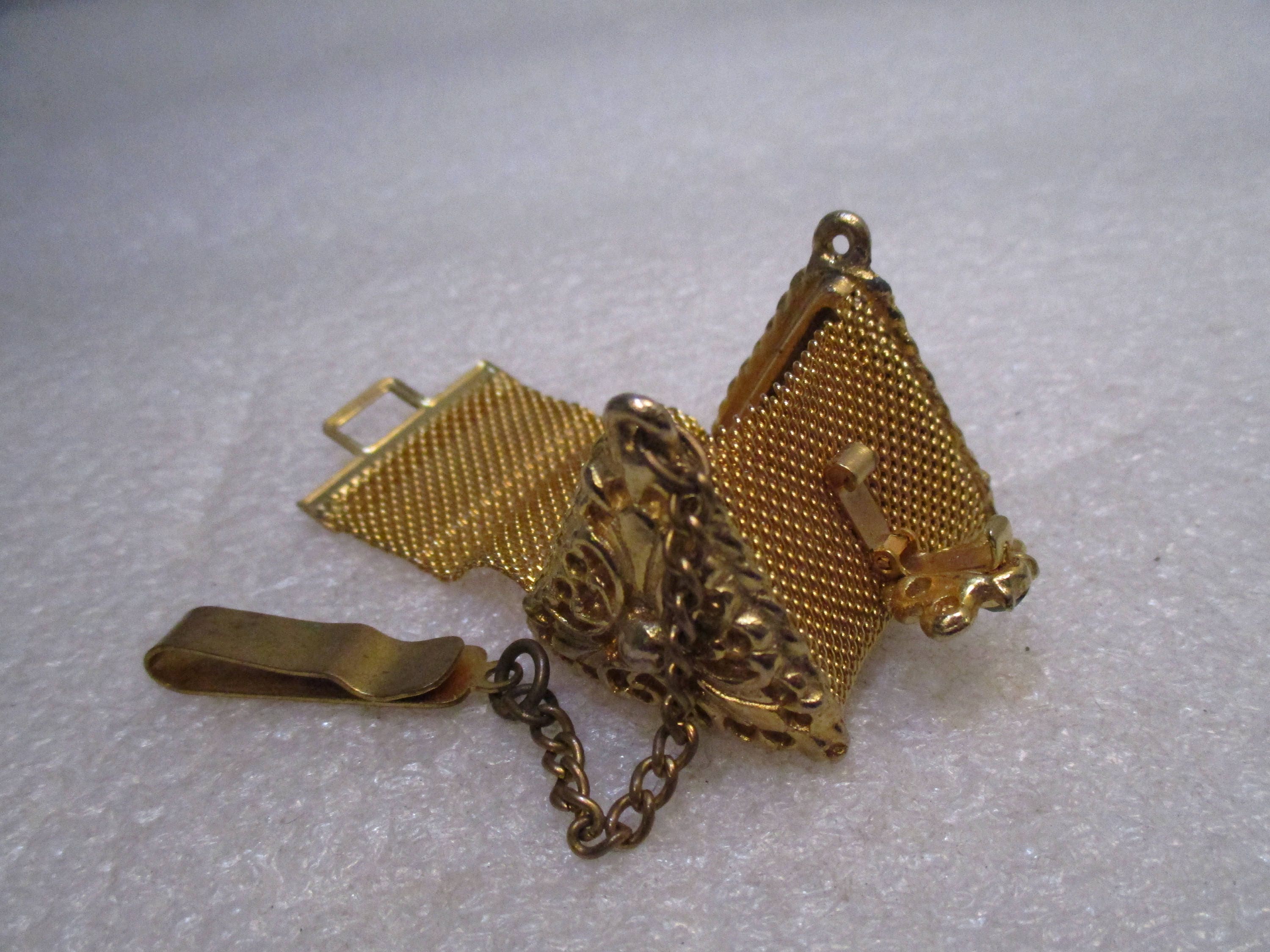 Vintage Mesh Purse Pill Box, With Chain/Clip. Mid-Century, triangular, 1" down each side with a green rhinestone clasp. This has a 3" chain with an art deco accented clip. The ends of the mesh purse are a heavy repousse more Victorian Scrolled look to it. This is not signed. It is in very good condition. It is from a PA estate. See photos. (Lot. Loc. W.7.2917G. 8 - 9/10/17).