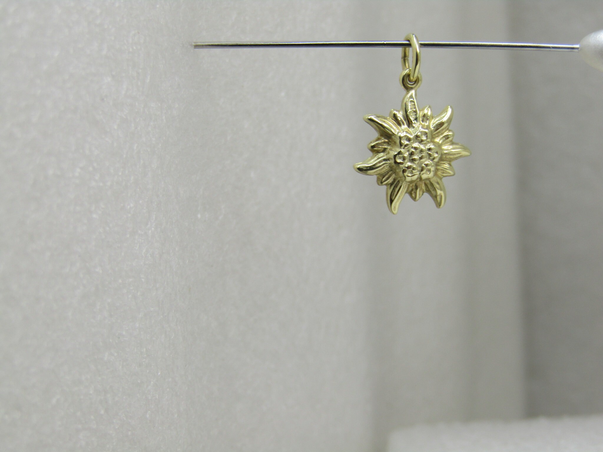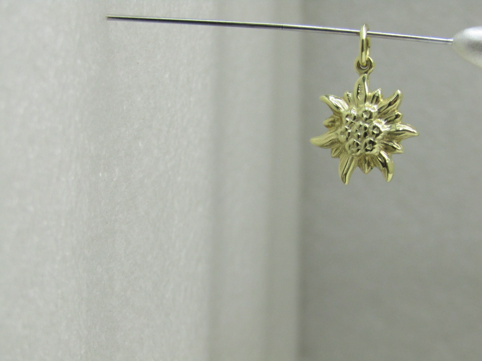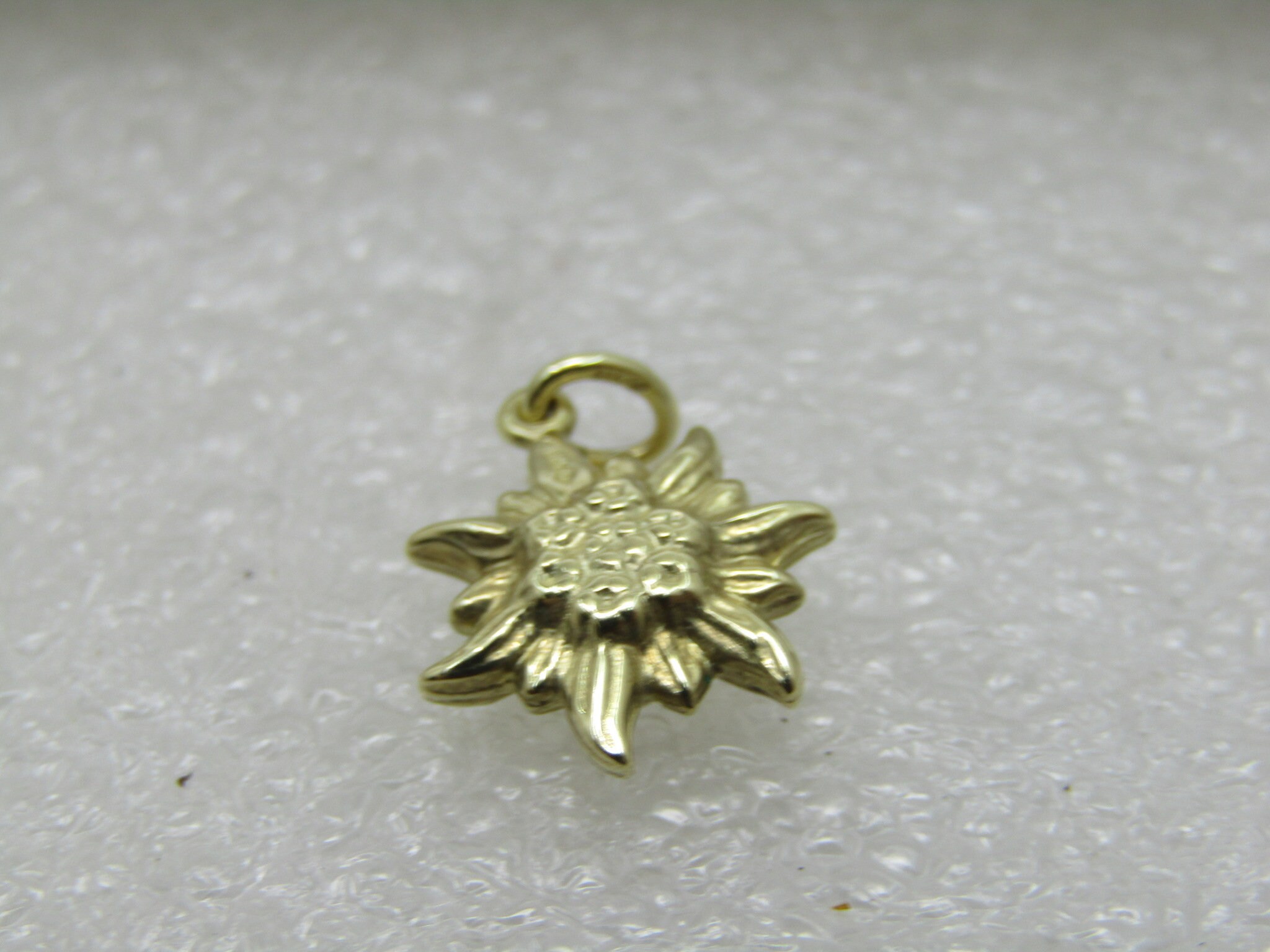 14kt Edelweiss Charm or Pendant, marked .585 and tested, yellow gold, signed with a mark inside a diamond outline. It is 3/4" long and 1/2" wide. Appx. weight is .76 grams. Two-sided. Appx. age is 1960's-1970's. Edelweiss is a popular flower in Austria and Germany and you may remember it from the Sound of Music. This is weighed on a jeweler's digital scale that is calibrated. However, your scale may differ. This is being sold not by scrap but by value of the piece as it is considering workmanship, design, etc. Therefore place take this into consideration when purchasing as it is not a scrap piece and weight is not really figured in. Very good condition - looks new. See photos. . (Lot. Loc. W.5.419.G.2X7). LD 6/11/19).